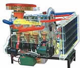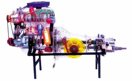 本品選用透明有機玻璃制作,內中部件均以硬質塑料料加工,用 螺絲固定在金屬高溫烘漆而成的車架上。各總成部分都以壓模成形加 工,代替過去膠粘合的方法,使產品在強度上有很大提高。發動機總成用電機驅動,在油門處設有調速裝置,能演示發動機轉速高低。離合器分離明顯,操縱靈活,離合器外殼整體壓模而成,變速箱和各檔齒輪用各種顏色表示,換檔靈活,手制動美觀。后橋外形壓模而成,內中主減速、差速轉動自如,輪轂剎蹄壓模成型,剎蹄可調節,前橋輪鼓可調整,轉向裝置以及電瓶、油箱、水箱,制動管路分布清楚一目了然。電路采用對插件前后分布,燈架、風窗、儀表板、后燈架用透明有機玻璃壓模成整體美觀逼真。