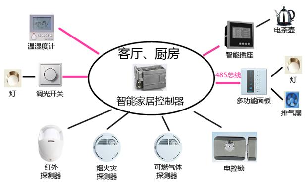 智能電子產(chǎn)品系統(tǒng)網(wǎng)絡示意圖 1. 家庭控制中心說明: 客廳廚房控制中心 客廳廚房控制中心包含智能家居控制器、電控鎖、多功能面板、節(jié)能燈、排氣扇、智能調(diào)光開關、智能光強及溫濕度計、智能插座、電茶壺、可燃氣體探測器、煙火災探測器及紅外探測器。 電控鎖通過智能家居控制器控制門的開啟;多功能面板控制客廳、廚房燈的開關;智能調(diào)光開關調(diào)節(jié)LED燈的亮度、也可通過485總線與智能家居控制器通訊,通過情景模式智能調(diào)節(jié)LED燈的亮度;智能光強及溫濕度計顯示采集客廳溫濕度及光照度;智能插座控制和采集電茶壺的電源和電量信息,可合理分配用電負荷;可燃氣體探測器、煙火災探測器及紅外探測器用于組件家居系統(tǒng)的安防系統(tǒng)。 多功能面板、智能調(diào)光開關、智能光強及溫濕度計、智能插座通過485總線與智能家居控制器通訊,可燃氣體探測器、煙火災探測器、紅外探測器及電控鎖通過I\O口與智能家居控制器通訊。