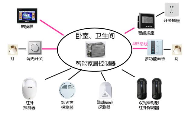 智能電子產(chǎn)品系統(tǒng)客廳廚房安裝配置圖 臥室衛(wèi)生間控制中心 臥室衛(wèi)生間控制中心包含智能家居控制器、觸摸屏、多功能面板、智能調(diào)光開關、智能插座、煙火災探測器、紅外探測器、玻璃破碎探測器、雙光束對射紅外探測器。 觸摸屏通過485與智能家居控制器通訊,可實現(xiàn)遙控、遙信、遙調(diào)及情景模式的設定;智能調(diào)光開關調(diào)節(jié)白熾燈的亮度、也可通過485總線與智能家居控制器通訊,通過情景模式智能調(diào)節(jié)白熾燈的亮度;多功能面板控制臥室、衛(wèi)生間燈的開合;智能插座控制和采集相關用電設備電源和電量信息,可合理分配用電負荷;煙火災探測器、紅外探測器、玻璃破碎探測器、雙光束對射紅外探測器用于組件家居系統(tǒng)的安防系統(tǒng)。 觸摸屏、多功能面板、智能調(diào)光開關、智能插座通過485總線與智能家居控制器通訊,煙火災探測器、紅外探測器、玻璃破碎探測器及雙光束對射紅外探測器通過I\O口與智能家居控制器通訊。